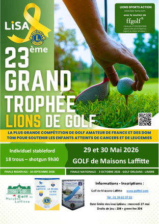 Les Lions Club de Maison Laffitte – Le Mesnil le Roi et Sartrouville organisent, les vendredi et samedi 29-30 mai, un Concours de Qualification au Golf de Maisons-Laffitte dans le cadre du 23e Grand Trophée Golf Lions 2026.